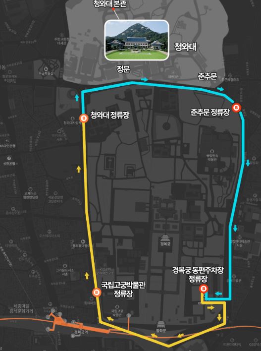자차를 이용하여 경복궁 주차장을 이용하신 분들은 경복궁 동편 주차장 정류장에서 셔틀버스를 탑승하시면 청와대 정문으로 편하게 이동이 가능합니다.