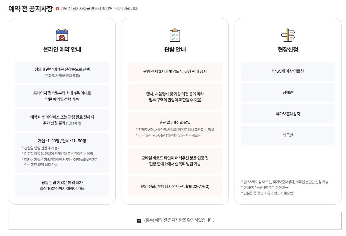 청와대 관람 신청은 청와대 개방예약 사이트에서 가능합니다.