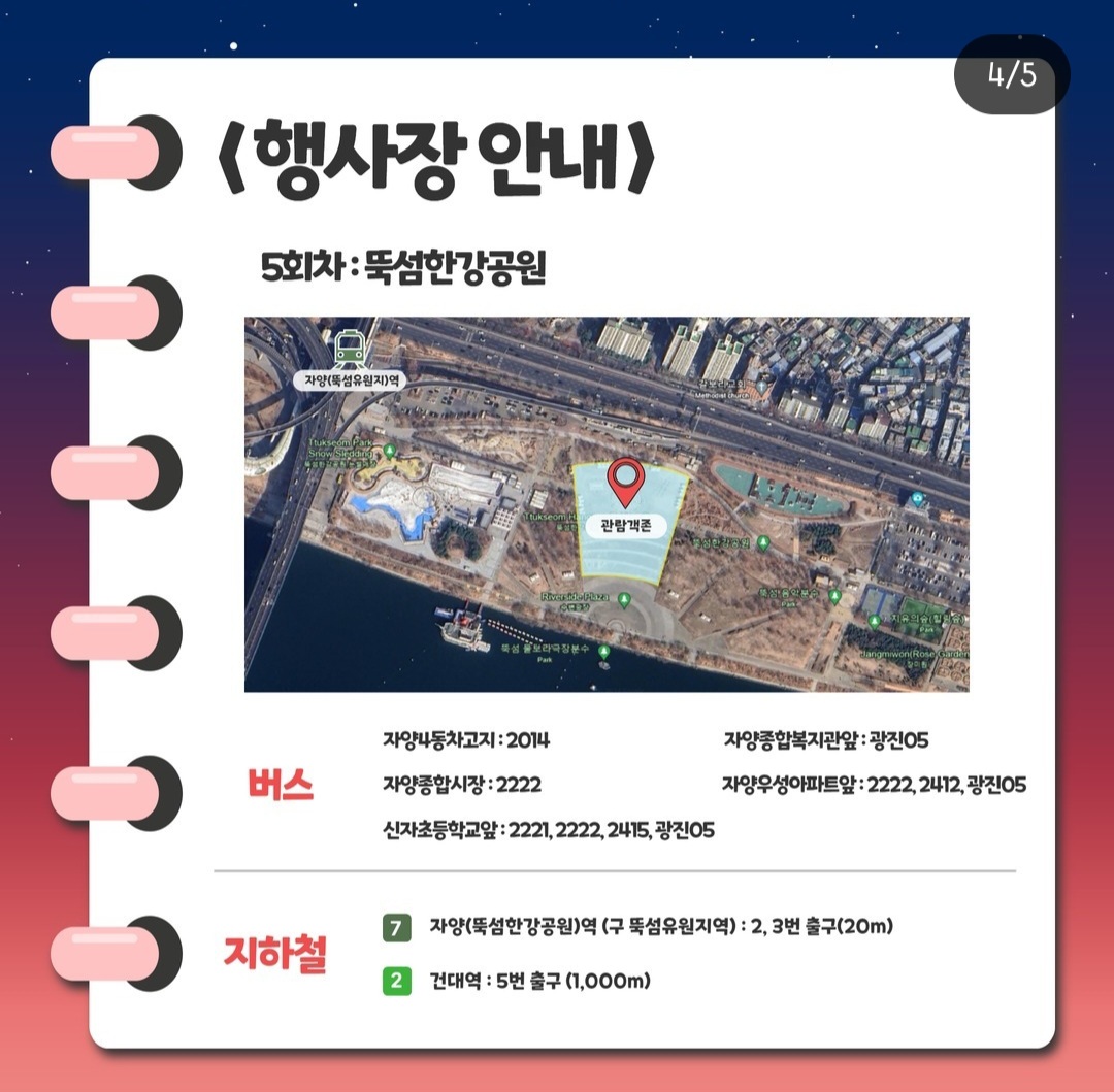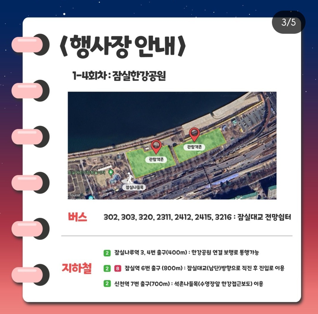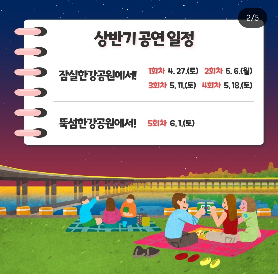 1~4회차까지는 잠실한강공원에서 진행되며, 5회차 공연은 뚝섬한강공원에서 진행될 예정입니다.